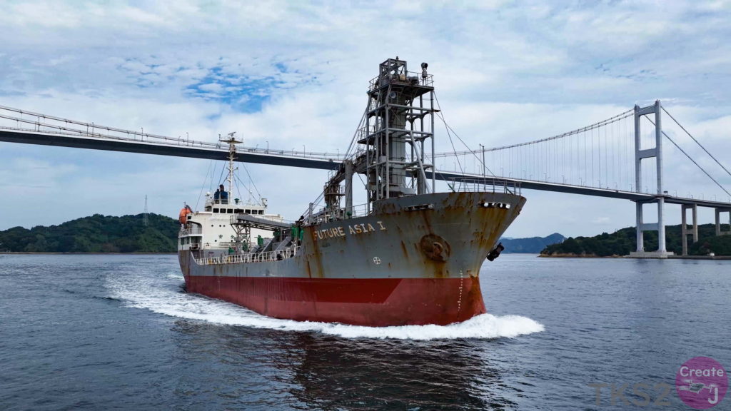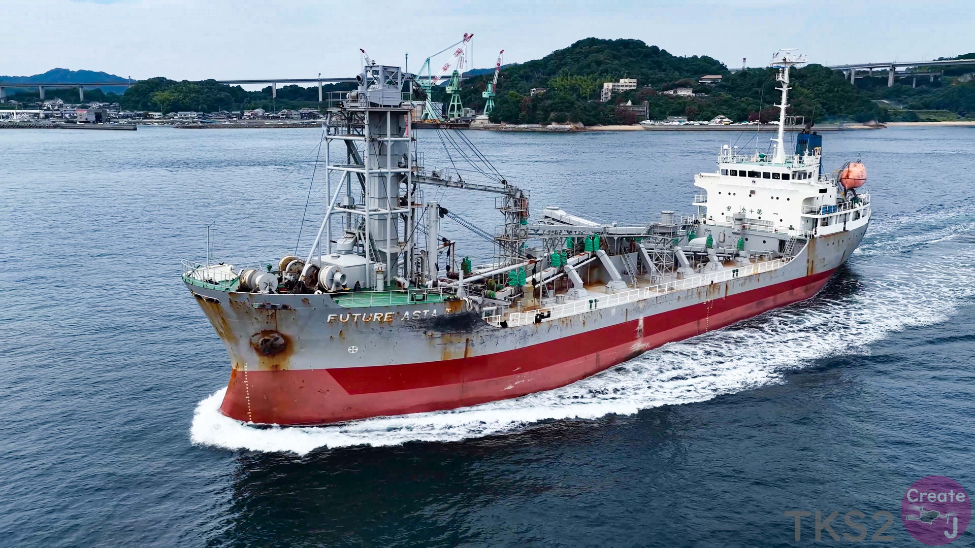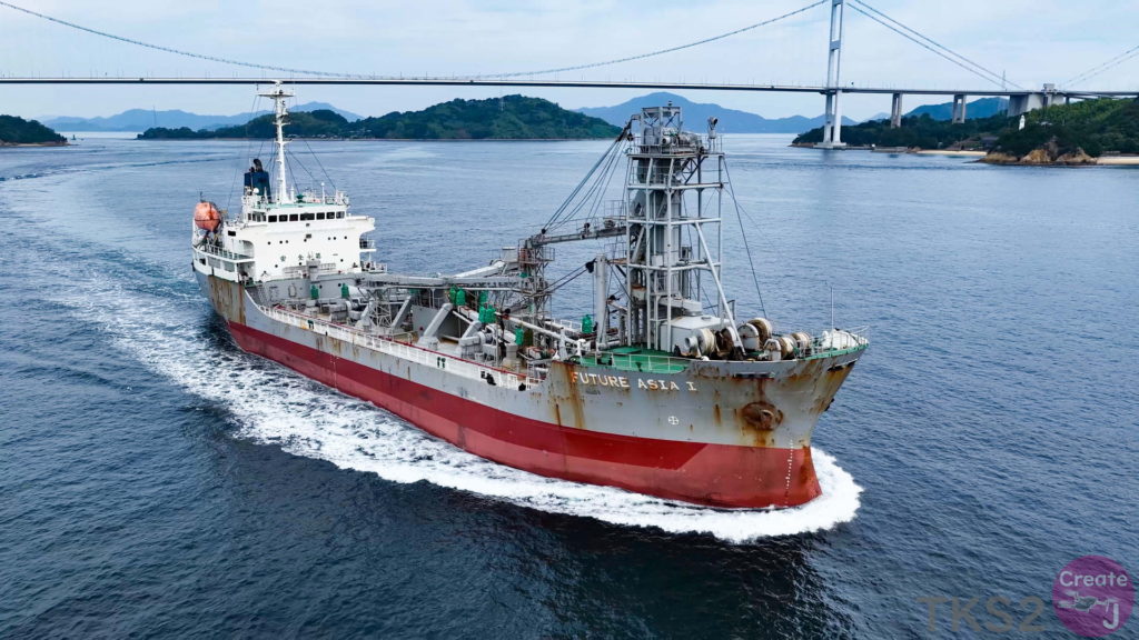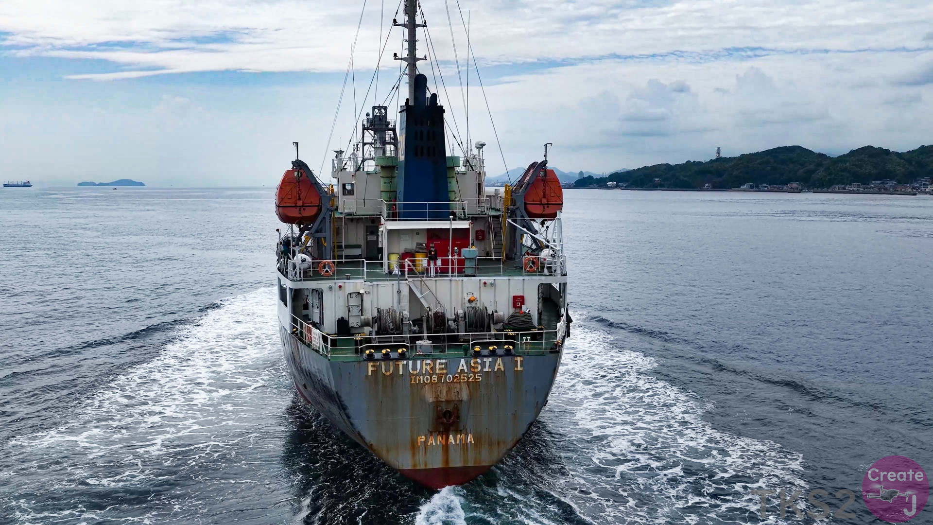 船齢38年 未だ現役!「 FUTURE ASIA I 」1987年7月29日竣工 今治造船 投稿者: drone2025年11月2日2025年11月2日Cargo Vessels、Ship空撮、来島海峡空撮 エスオーシー物流/タイヨウ汽船 の “大翔丸” だった。かつて今治港にも寄港していた関西汽船「くれない丸」、後の「ロイヤルウイング」は船齢63年をもって運航休止! CALL SIGN : 3FUN2IMO NO : 8702525MMSI : 353584000G.T. :3,415D.W. :5,678全長 : 93.02M型幅 : 16.30M型深 : 8.20M満載喫水: 6.774M速力 : 15.2ノット(最大)、12.5ノット(航海)