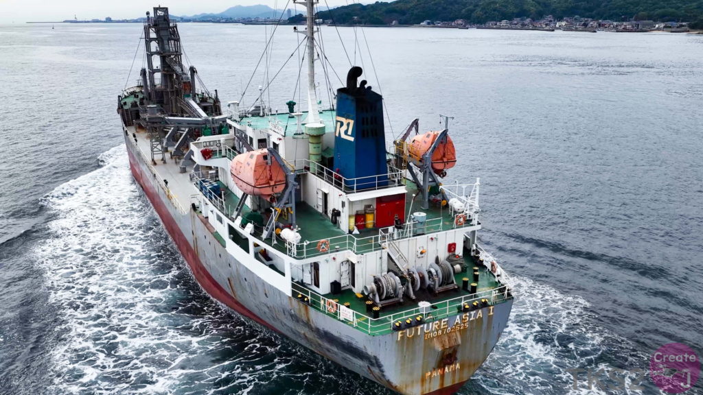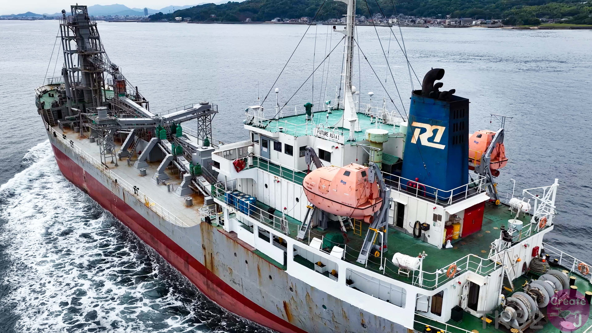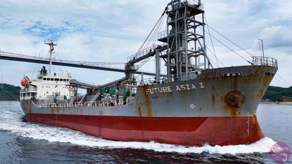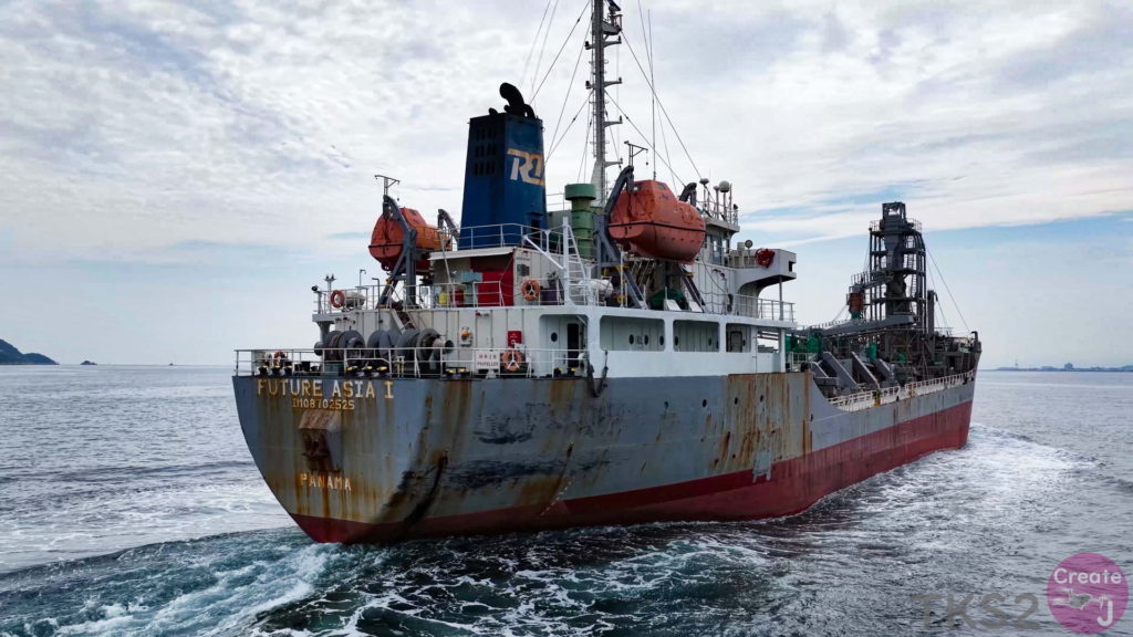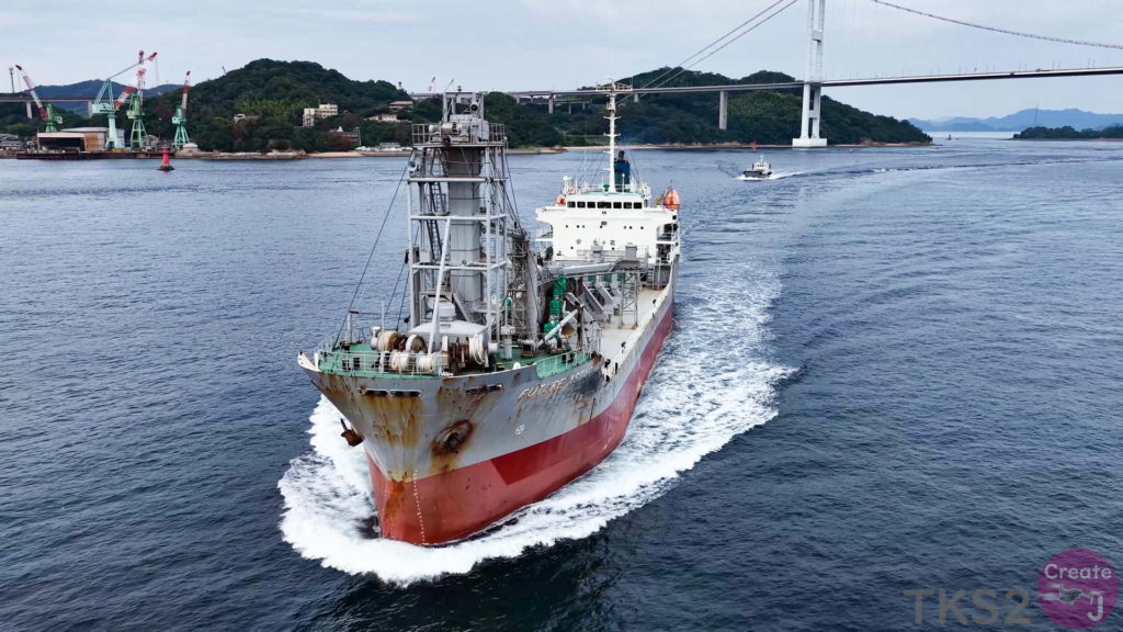 船齢38年 未だ現役!「 FUTURE ASIA I 」1987年7月29日竣工 今治造船 投稿者: drone2025年11月2日2025年11月2日Cargo Vessels、Ship空撮、来島海峡空撮 エスオーシー物流/タイヨウ汽船 の “大翔丸” だった。かつて今治港にも寄港していた関西汽船「くれない丸」、後の「ロイヤルウイング」は船齢63年をもって運航休止! CALL SIGN : 3FUN2IMO NO : 8702525MMSI : 353584000G.T. :3,415D.W. :5,678全長 : 93.02M型幅 : 16.30M型深 : 8.20M満載喫水: 6.774M速力 : 15.2ノット(最大)、12.5ノット(航海)