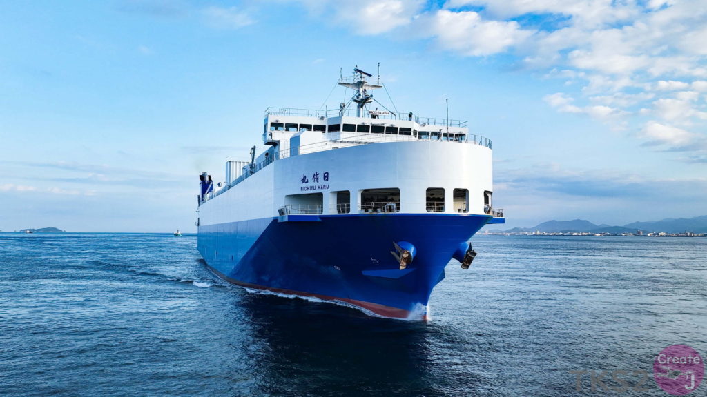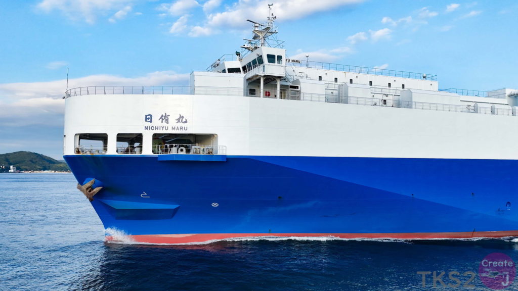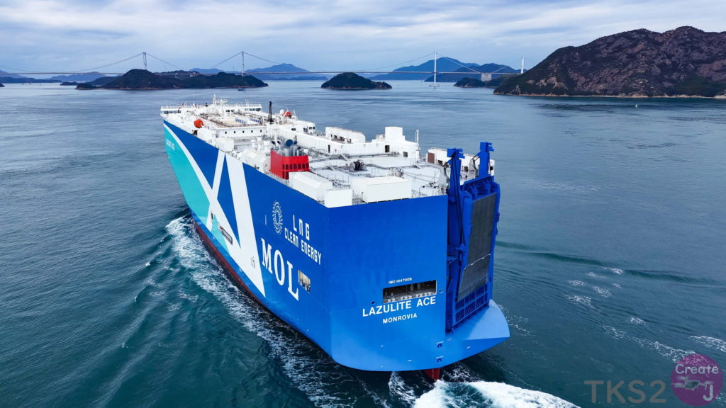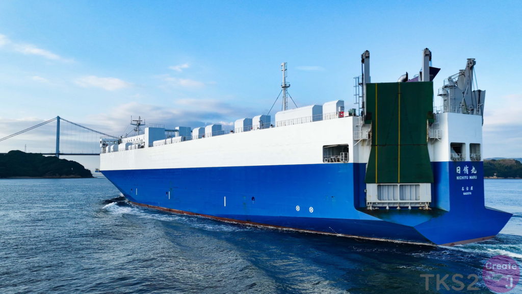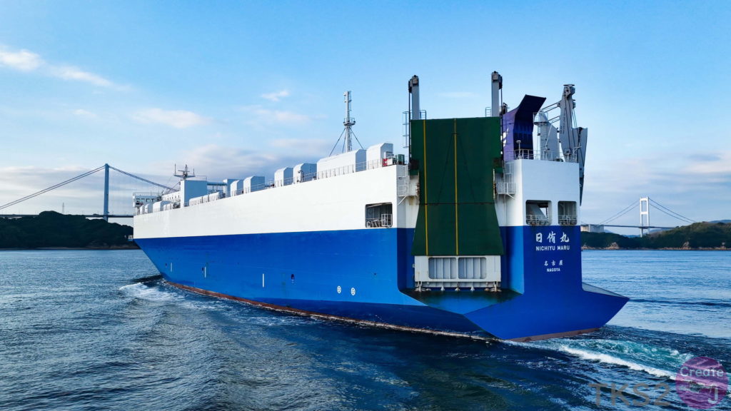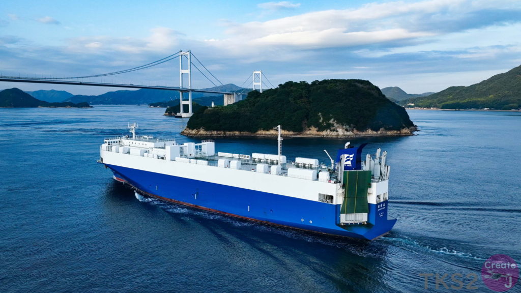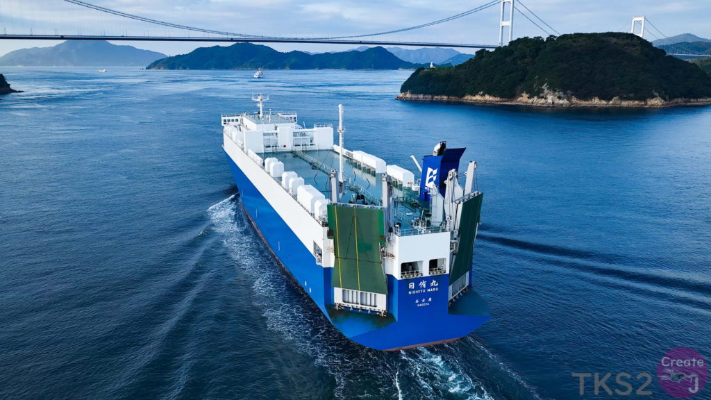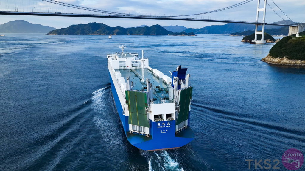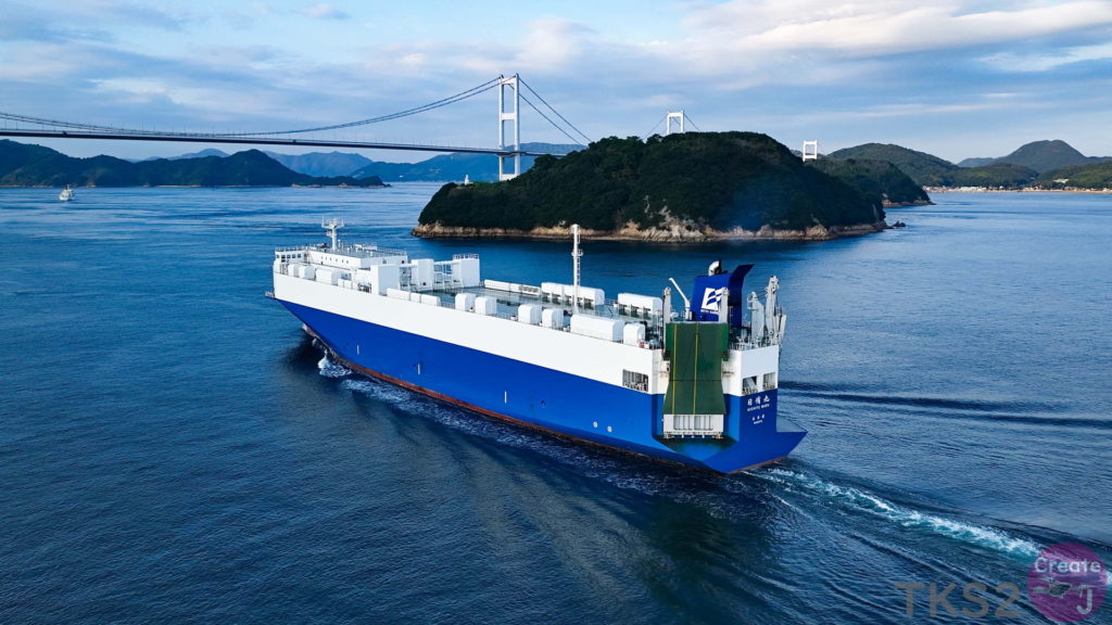 今回は、尾道造船を出渠し新門司港へ回航です。普段昼間にはこの来島海峡では見られません。