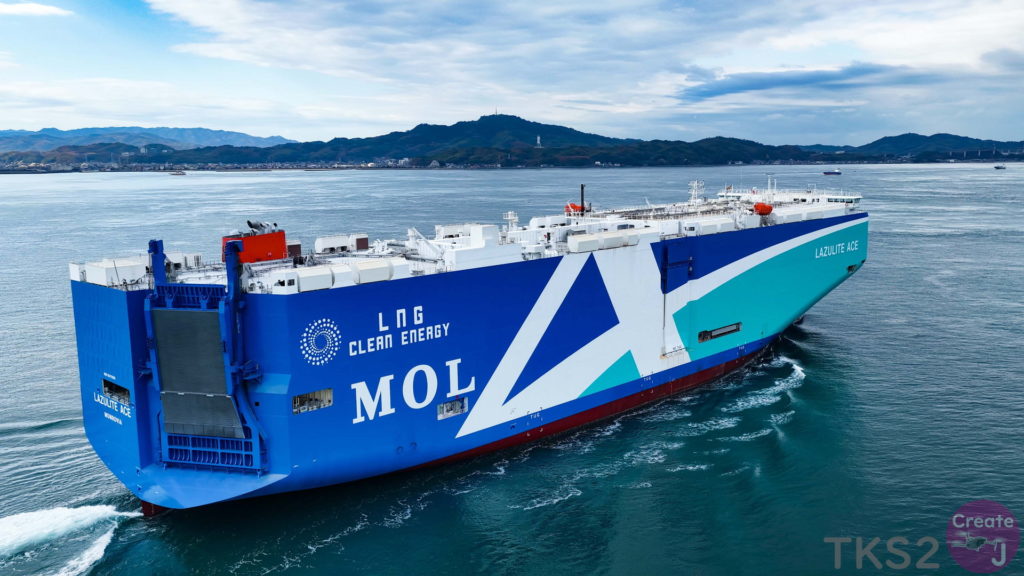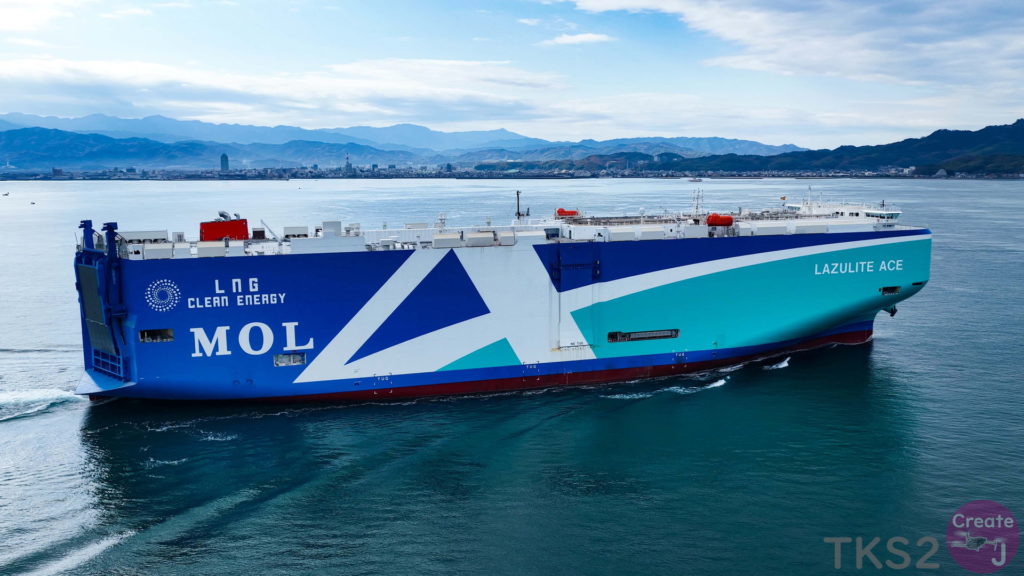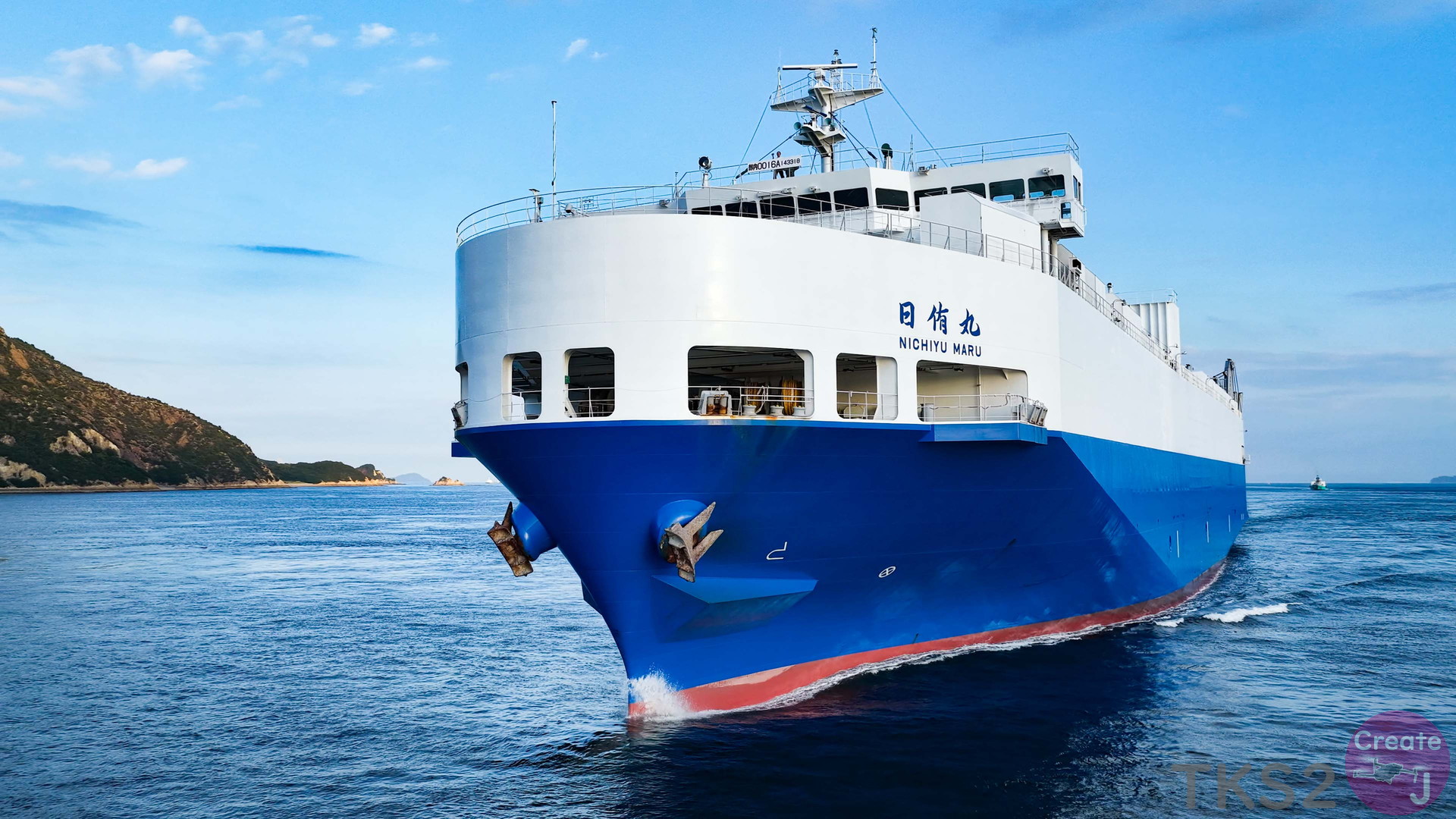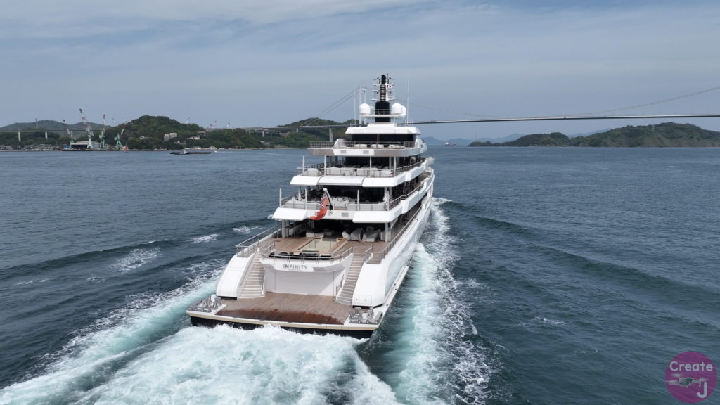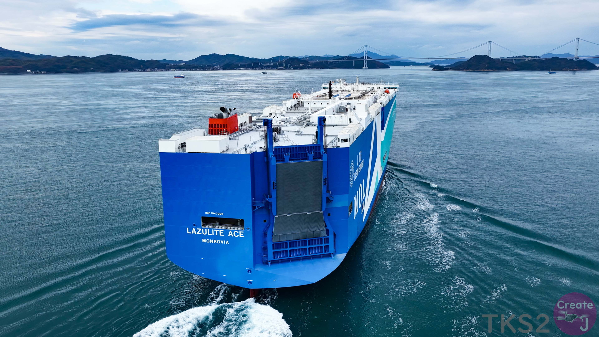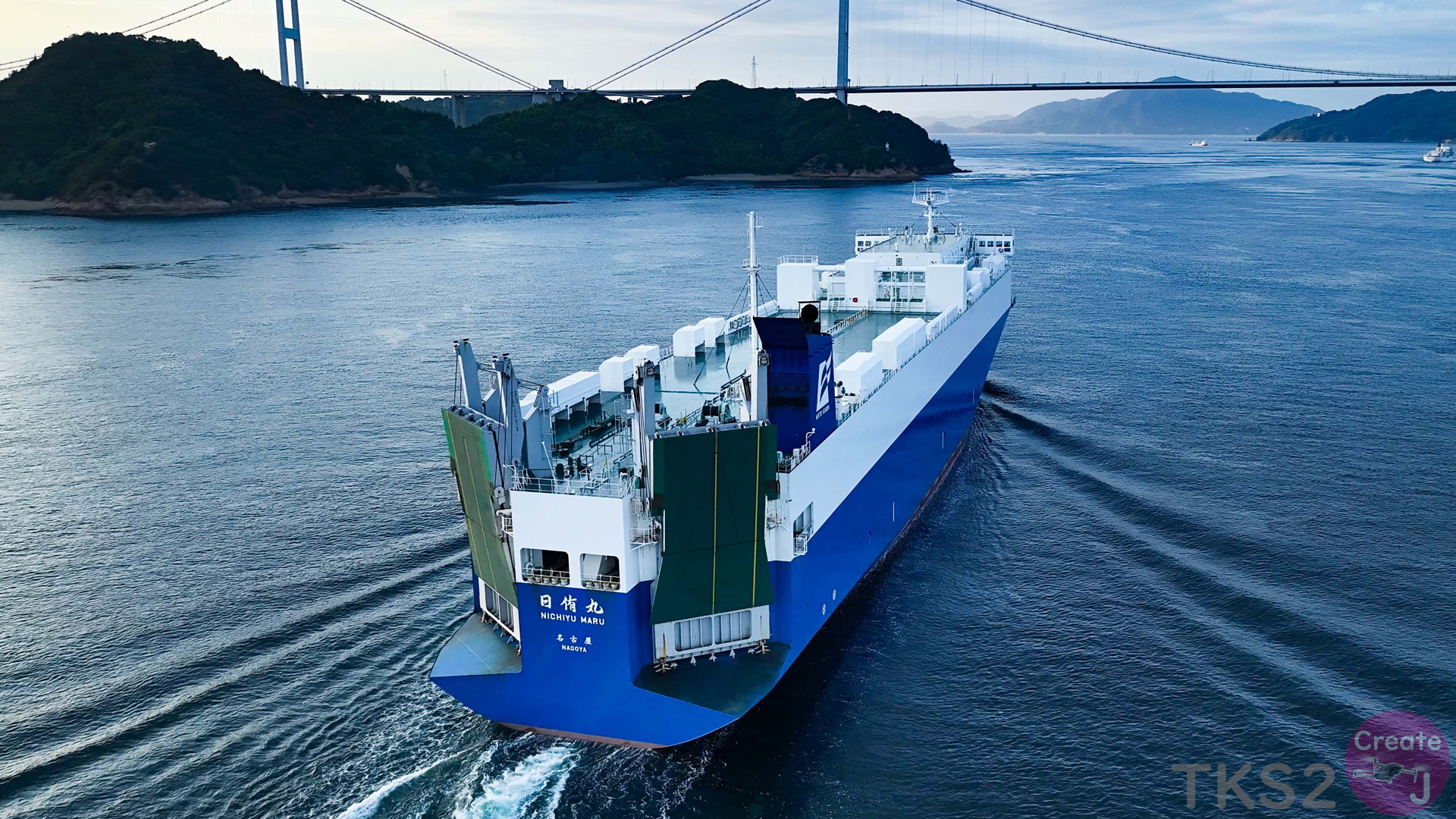 今回は、尾道造船を出渠し新門司港へ回航です。普段昼間にはこの来島海峡では見られません。